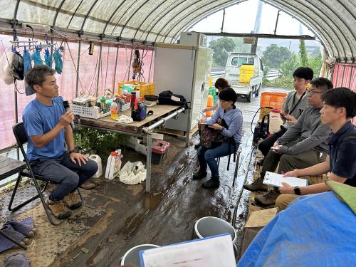 その後、作業場ハウス内で、吉岡さんの体験談を聞きました。吉岡さんが農業を始めたいと思った経緯から、アカデミー研修農場での研修時の様子、農地探しの様子などをお話しいただきました。特に農地については、同期の方々の就農地などとも比べながら自身はかなりの好条件の場所を借りられたので運が良かったと話されていたのが印象的でした。就農してからは、技術的には成功も失敗もあることや、地域のつながりを大切にしてちょっとした課題を解決してきたことなど、リアルを感じるお話でした。就農開始にあたっての自己資金をどのくらい使ったか、今現在の売り上げ状況なども質問に答えてくださり、アンケートでは「農業についた現場の方の声が聞けて良かった」「一生懸命に取り組まれてきた話が良かった」と本ツアーの目的を達成できた感想が寄せられ、事務局としても大変うれしく思います。最後には雨があがったので、吉岡さんの実際に購入された農業機械などを見ながら開業資金についての話題なども盛り上がりました。